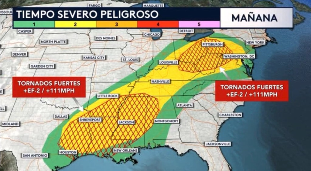 •Para el día de mañana, como habíamos visto en nuestro radar simulado, esperamos que toda esta actividad de aguacero y tormenta se siga desplazando al este junto con nuestro frente frío. Al igual que hoy, esto pondrá a una extensa zona del país bajo la amenaza de tiempo severo, desde Texas hasta el estado de Nueva York, donde tendremos riesgos de bajos a leves (niveles 1 y 2 en la escala que va hasta 5, respectivamente). Nuevamente nos estaremos enfrentando con el riesgo de algunos tornados que pudieran ser fuertes, especialmente en las zonas que ven sombreadas con el color rojo indicadas por las flechas que incluyen la región Ark-La-Tx, el Valle Inferior del Río Mississippi, el Medio-Sur, el Valle Superior del Río Ohio y los Apalaches centrales. Además de este riesgo significativo de tornado, las tormentas eléctricas también serán capaces de producir granizadas (aunque no tan grandes como las de hoy), y ráfagas de viento de fuertes a dañinas.