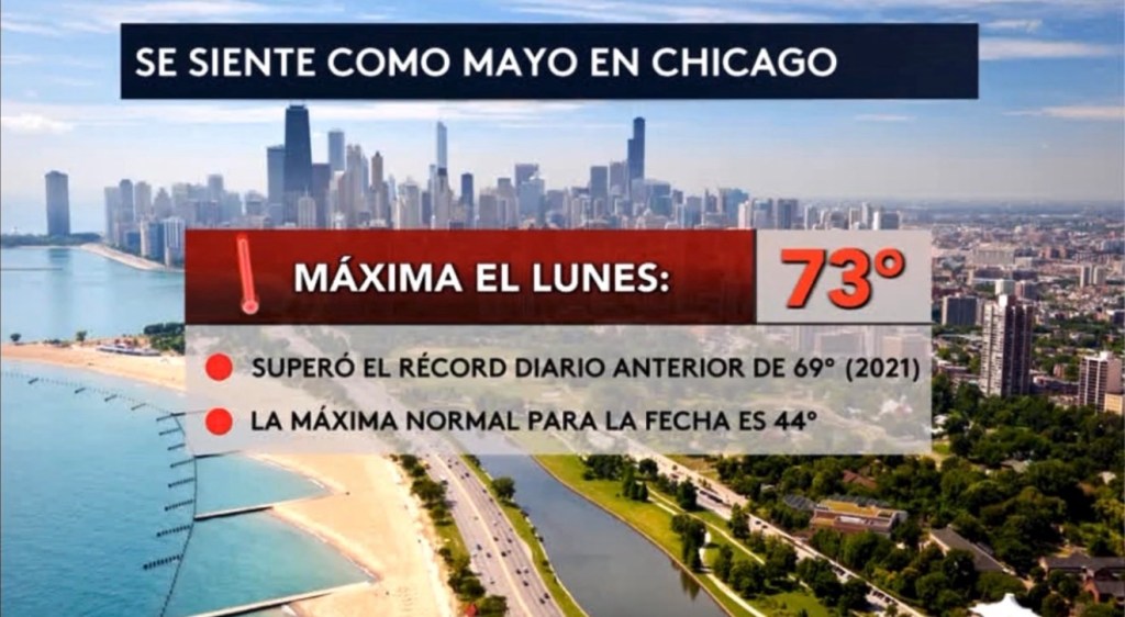 •Les decimos buenos días a Chicago donde si no tuviéramos un calendario, ¡no sabríamos que estamos en marzo! Ayer se registró una temperatura máxima de 73°F, superando el récord diario anterior de 69°F que fue establecido en el 2021. La máxima normal para la ciudad de los vientos para la fecha de es 44°F, ¡con la máxima de ayer haciéndose que se sienta como mayo!