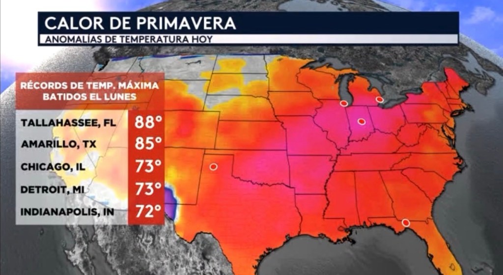 •Chicago no fue la única ciudad que ayer batió un récord diario de temperatura máxima, sino también Tallahassee, Florida; Amarillo, Texas; Detroit, Michigan e Indianápolis, Indiana.