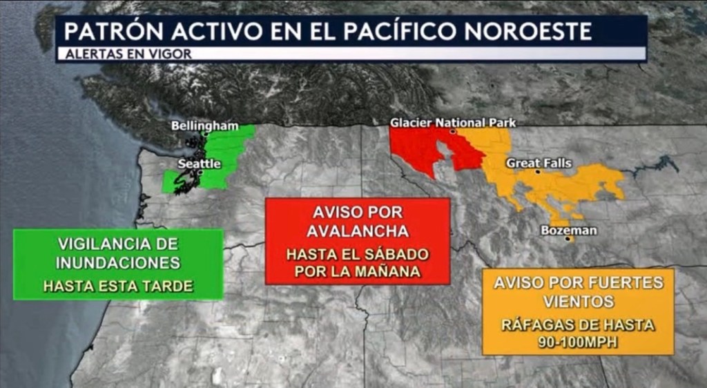 •Seguimos observando un patrón activo en el Pacífico Noroeste, donde un río atmosférico que ha estado trayendo lluvia desde el inicio de la semana continuará impactando a la región hasta mañana sábado. Hay una vigilancia por inundaciones para Washington incluyendo Seattle hasta esta tarde a las 5:00PM hora del Pacífico. Hay un aviso por avalancha en el norte de Montana para los Rangos Whitefish, Swan y Flathead incluyendo el Parque Nacional Glacier hasta las 6:00AM hora de montaña mañana sábado debido a la combinación de esta lluvia y temperaturas que son más cálidas de lo normal. También hay un aviso por fuertes vientos para partes de Montana incluyendo el área de Great Falls por ráfagas dañinas que pudieran alcanzar las 90 mph y hasta las 100 mph en las laderas orientales del frente de las Montañas Rocosas.