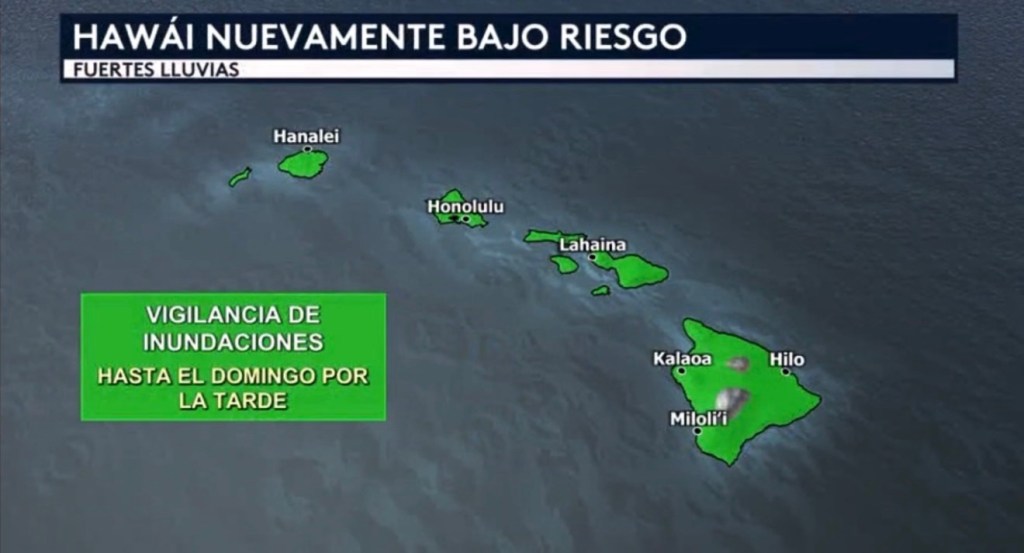 •Hawái está nuevamente bajo riesgo de experimentar fuertes lluvias e inundaciones repentinas hasta el fin de semana debido a otra “Baja Kona” arrastrando abundantes cantidades de humedad hacia el norte en dirección a las islas. Hay una vigilancia por inundaciones para todas las islas hawaianas hasta el domingo por la tarde.