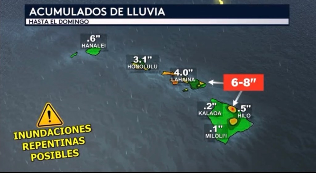 •Podemos ver totales aislados de lluvia en tanto la Isla Grande como Maui de entre 6 a 8 pulgadas entre hoy y el domingo, con partes de Oahu recibiendo entre 3 a 5 pulgadas. Inundaciones repentinas serán posibles.