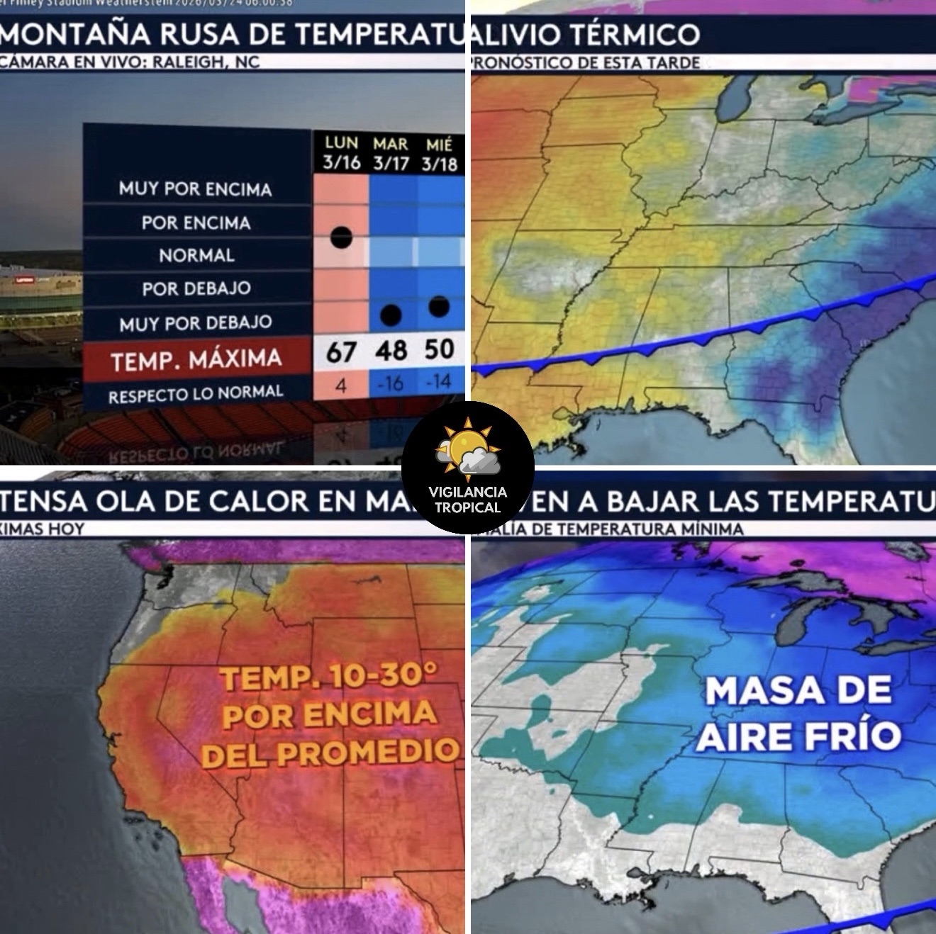•El mismo frente frío que ayer estaba trayendo una mañana lluviosa para lugares como la ciudad de Nueva York y Washington DC se ha desplazado al sur, ¡permitiendo a que una masa de aire más frío resulte hoy en temperaturas máximas al Atlántico Medio y Sureste de hasta 30 grados más fríos que ayer! Hasta el norte de Florida y lugares como Jacksonville y Tallahassee se verán afectados por este aire más fresco para esta jornada del martes. ¡Raleigh se mantiene en esa montaña rusa de temperatura con una máxima hoy en el rango medio de los 50 grados cuando ayer habían registrado una en el medio rango de los 80 grados! Charlestón, Carolina del Sur hoy estarán registrando una máxima en el alto rango de los 50 grados cuando ayer tuvieron una máxima de 90 grados.