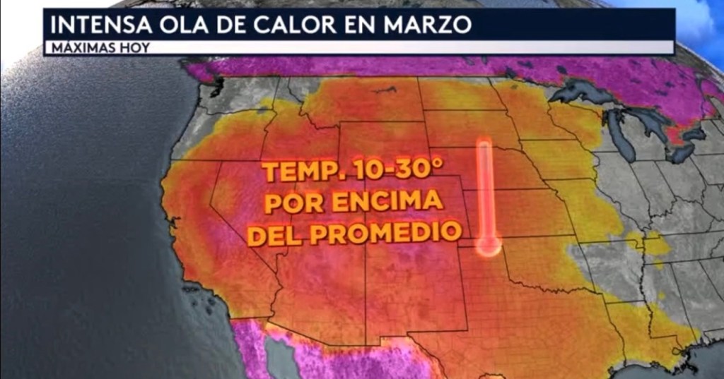 •Seguimos hablando de una intensa ola de calor de marzo, donde hoy las temperaturas máximas serán de entre 10 y 30 grados por encima de lo normal para esta época del año en las partes occidentales y centrales del país. Todas las ciudades que ven dentro de las cajas blancas pudieran hoy batir un récord diario de temperatura máxima, incluyendo muchos que ya han experimentado sus temperaturas más calientes jamás registradas en el mes de marzo en la última semana.