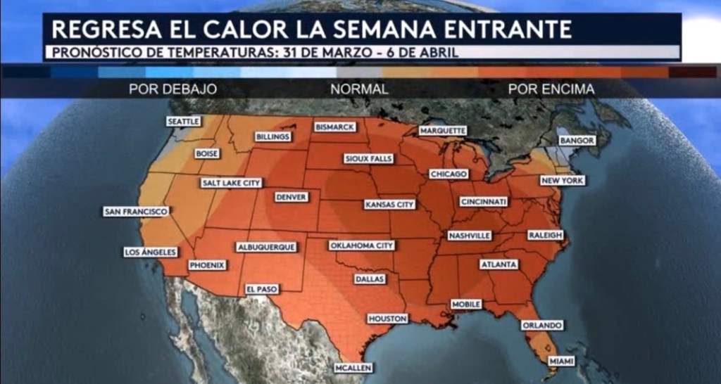 •¿Crees que nuestra montaña rusa de temperatura se acaba ahí? ¡Piénsalo de nuevo! Para la semana entrante (31 de marzo-6 de abril), después de este enfriamiento, estaremos viendo temperaturas por encima del promedio nuevamente apoderándose de mucho del país, según el pronóstico más reciente del Centro del Predicción del Clima.