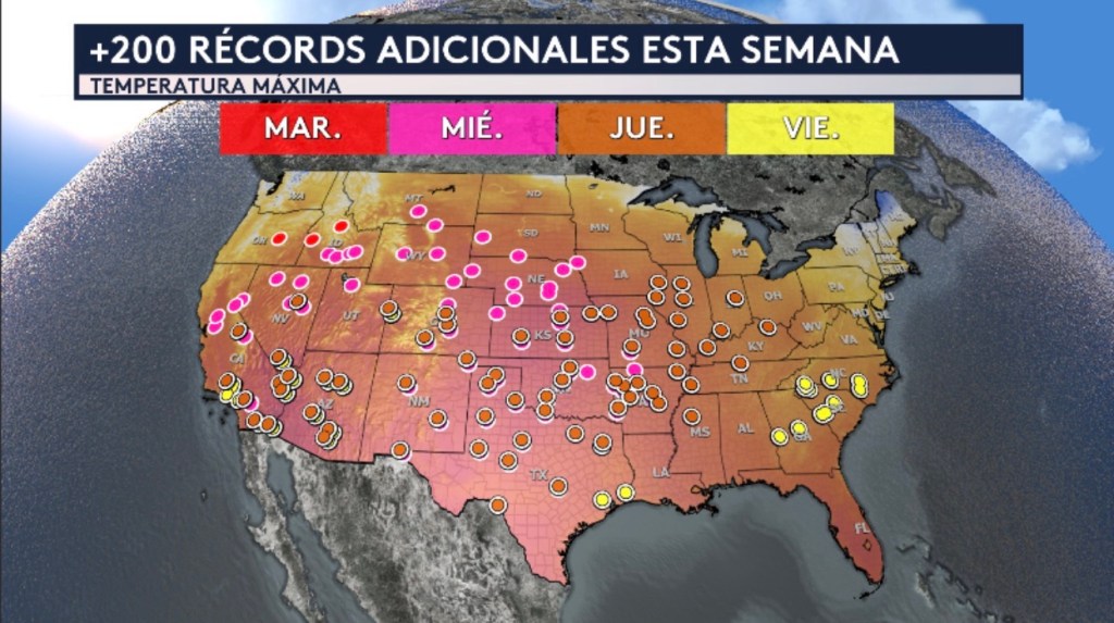 •Más de 200 ciudades desde la costa oeste hasta el Atlántico Medio pudieran estar nuevamente batiendo récords diarios de temperatura máxima esta semana con nuestro domo de calor que se expande.
