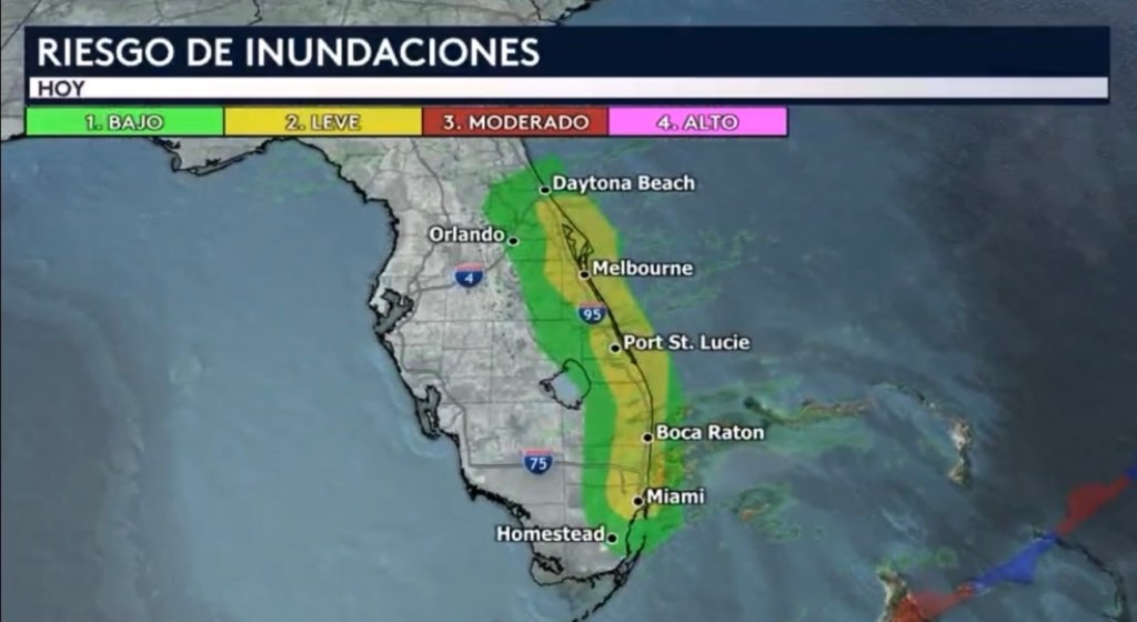 •Hoy nuevamente habrá un riesgo de inundaciones repentinas debido a las fuertes lluvias que estamos pronosticando, específicamente para la costa este del centro y sur de Florida donde el Centro del Predicción del Tiempo ha emitido riesgos de bajos (nivel 1 de 4) a leves (nivel 2 de 4). Incluye lugares como Miami, Fort Lauderdale, Port St. Lucie, Orlando, Melbourne, y Daytona Beach.