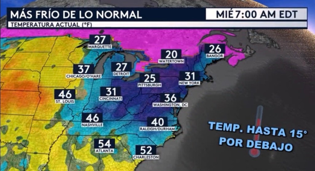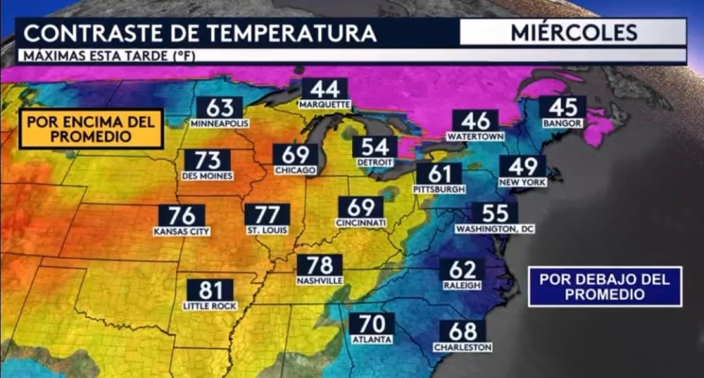•El Atlántico Medio, los Grandes Lagos, el Valle del Río Ohio, y el Noreste están despertando con temperaturas son hasta 15 grados por debajo del promedio para esta época del año esta mañana. Para esta tarde, veremos cómo tendremos un contraste de temperatura, con máximas más frías de lo normal para los que se ubican al este de los Apalaches y máximas más cálidas de lo normal para los que se ubican al oeste de los Apalaches.