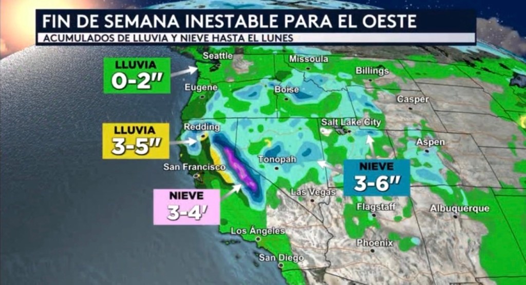 •Este mismo sistema frontal de baja presión además de otro que estará llegando a la costa de California mañana estarán trayendo un patrón de tiempo inestable al Oeste este fin de semana. Estamos esperando acumulados de lluvia generalizados y nieve acumulable en las elevaciones más altas. Las Montañas Sierra Nevada estarán recibiendo nieve muy beneficiosa, ¡de hasta 4 pies en algunos lugares aislados! Partes de la Gran Cuenca y las Rocosas pudieran recibir entre 3 a 6 pulgadas. Acumulados de lluvia serán principalmente ligeras a través de mucho del Oeste con el centro y norte de California y Oregón recibiendo la mayor cantidad. Partes de la costa del norte de California y el norte del Valle de Sacramento alrededor del área de Redding pudieran recibir entre 3 a 5 pulgadas de lluvia. Este pronóstico de acumulación es válido hasta el lunes.