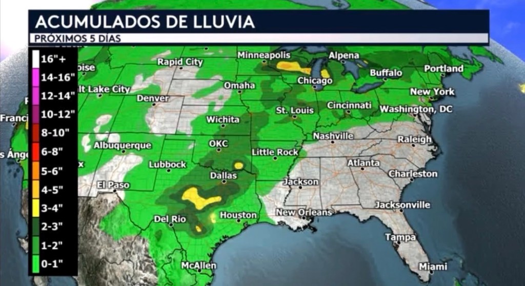 •Estas rondas recurrentes de tormentas estarán dejando acumulados generalizados de lluvia de al menos 1 a 2 pulgadas a través del centro y sur de las planicies con totales más altos posiblemente alcanzando las 3-4 pulgadas al sur de las planicies. Otro lugar que también pudiera estar recibiendo lluvia más abundante es el Medio Oeste Superior y la región de los Grandes Lagos donde acumulados de entre 2 a 3 pulgadas con totales aislados más altos de hasta 4-5 pulgadas serán posibles. Este pronóstico de lluvia es válido para los próximos 5 días (hasta el miércoles de la semana entrante).