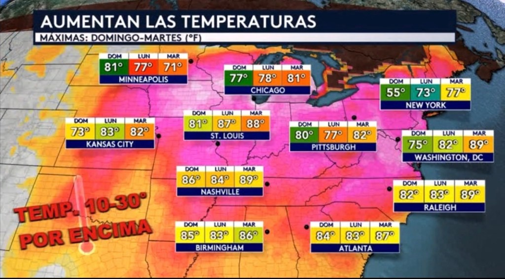 •Muchos a través de la mitad este del país estarán notando un ascenso en las temperaturas para para terminar el fin de semana y empezar la nueva semana laboral a medida que una dorsal en niveles altos se desarrolle en esta región. Máximas serán de entre 10 y hasta 30 grados por encima del promedio para esta época del año, donde ciudades como Chicago subirán a los 80 grados para el martes; St. Louis, Nashville, Raleigh y Washington DC casi a los 90 grados, y la ciudad de Nueva York casi a los 80 grados. Récords diarios serán posibles el martes.