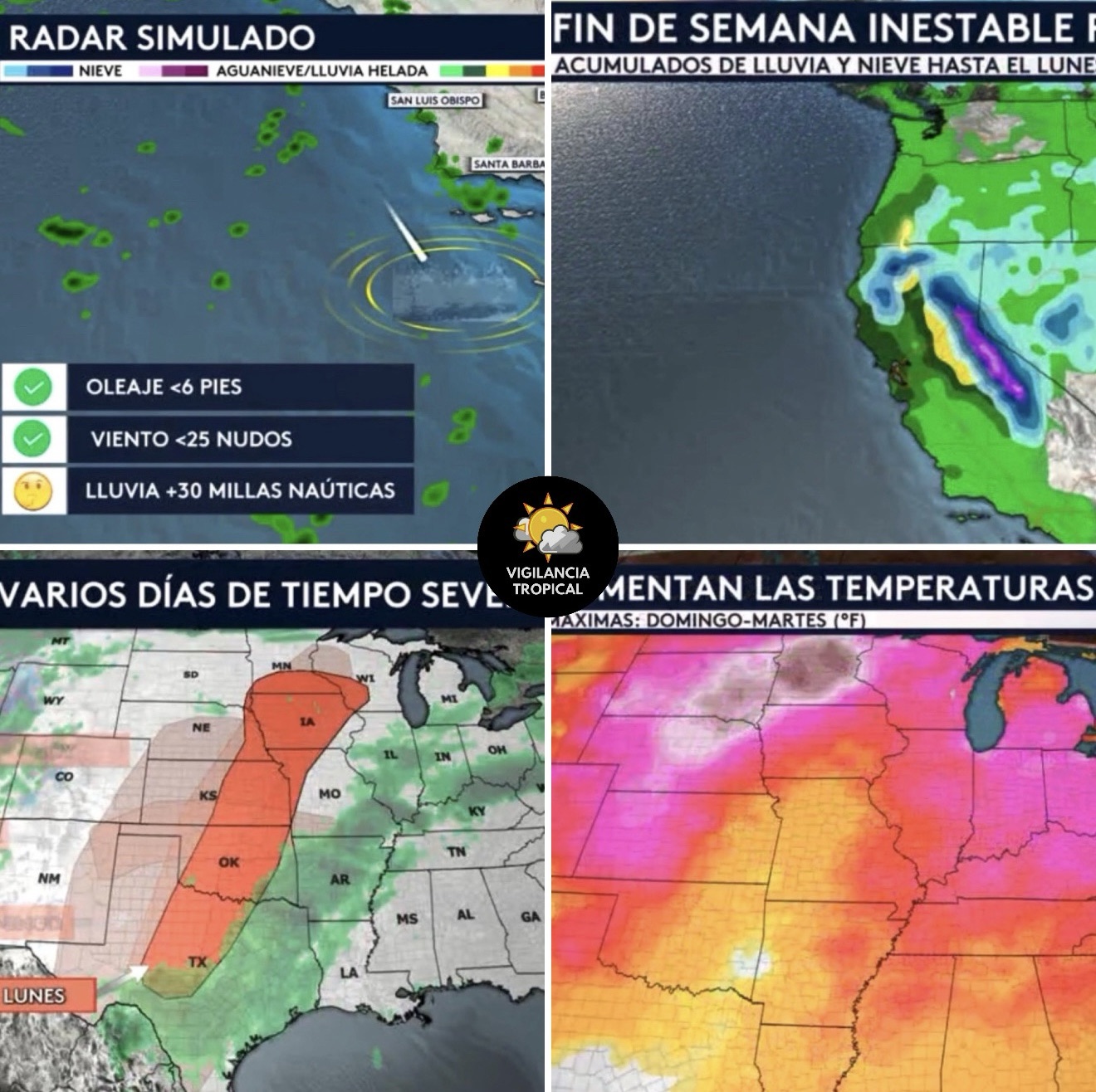 •Estaremos enfrentándonos con un patrón muy activo y un riesgo de varios días de tiempo severo, principalmente sobre el centro de Estados Unidos. Ya algunas tormentas severas fueron registradas anoche sobre las planicies centrales, que incluyó el aeropuerto internacional de Kansas City reportando una ráfaga de viento de 58 mph alrededor de la 3:00 de la mañana. Para el día de hoy, nuevamente habrá un riesgo de tormentas severas para las planicies centrales un poco más al sur de donde las vimos anoche. También lo habrá para el Valle de Sacramento en California y la Gran Cuenca. Algunos instantes de granizo pequeño y ráfagas de viento de fuertes a localmente dañinas serán posibles sobre el Valle de Sacramento con las células que estarán formándose esta tarde y durando hasta las primeras horas de la noche. Algunos vientos de microestallido seco de fuertes a localmente dañinos también serán posibles en La Gran Cuenca con esta actividad aislada de tormenta. El riesgo de tiempo severo no para hoy, ya que se mantendrá con nosotros hasta el miércoles de la semana entrante.