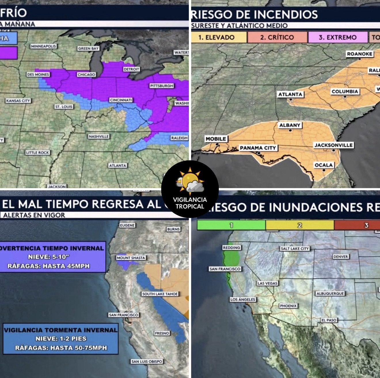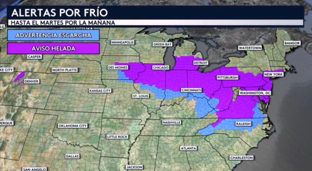 •Hay alertas por frío para 110 millones de personas esta mañana desde el Medio Oeste hacia el este a través del Valle del Río Ohio y hasta el noreste. Tenemos advertencias por escarcha y avisos por helada en vigor hasta mañana por la mañana para lugares como Chicago, Detroit, Cincinnati, Pittsburgh, Washington DC y Raleigh.