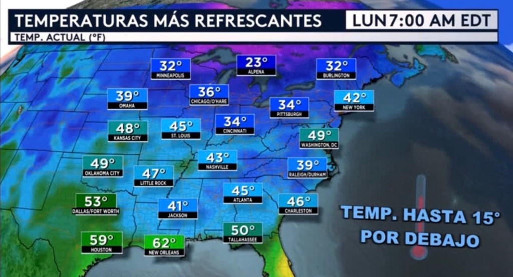 •La mitad este del país está despertando con temperaturas más refrescantes esta mañana tras el paso de un frente frío ayer. Temperatures actuales están en los 30 y 40 grados generalizados, con excepción de lugares más al sur sobre el norte de Florida y la costa norte del golfo donde tenemos temperatures en el rango de los 50 y 60 grados. Estos valores son de hasta 15 grados por debajo del promedio para esta época del año.