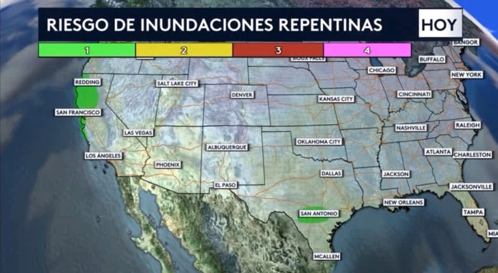 •Habrá un riesgo de inundaciones repentinas para dos de estas cuatro regiones hoy: la costa oeste incluyendo el Área de la Bahía de San Francisco y el norte de California y el centro-sur de Texas incluyendo el área metropolitana de San Antonio.