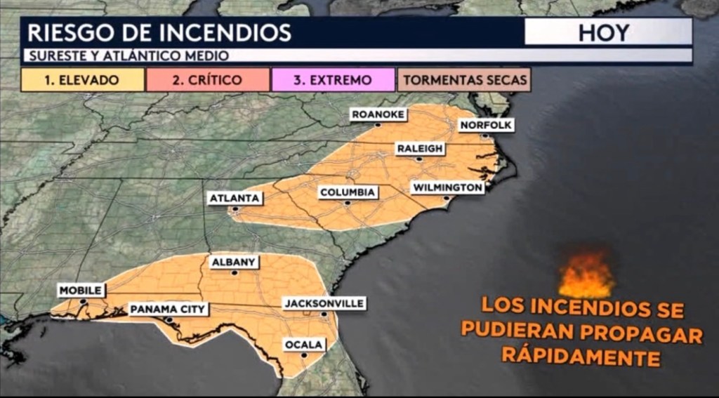 •El paso de este frente no solo ha traído una masa de aire más frío a la mitad este del país, sino también una más seco. En combinación con los combustibles secos y los fuertes vientos que estarán soplado detrás de este frente, tendremos hoy un riesgo elevado (nivel 1 de 3 en nuestra escala de evaluación de riesgo) de tiempo por incendio para el Sureste y Atlántico Medio incluyendo lugares como Mobile, Alabama; Jacksonville, Florida; Atlanta, Georgia; Columbia, Carolina del Sur; Raleigh, Carolina del Norte y Norfolk, Virginia. Lo que esto significa es que las ingredientes atmosféricos que tendremos en vigor hoy serán favorables para poder ayudar a que cualquier incendio que se inicie se propague rápidamente, entonces es importante en un día como hoy evitar cualquier quema al aire libre, no estacionar tu vehículo en la vegetación seca, y desechar los cigarrillos adecuadamente.