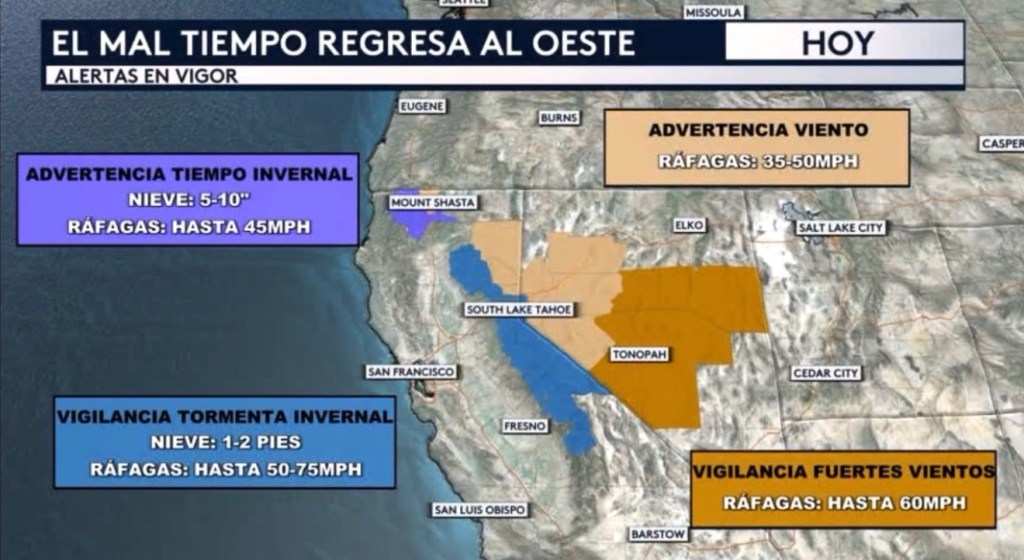 •El mal tiempo regresará al oeste esta semana, donde ya se han emitido alertas para partes de California y Nevada tanto por tiempo invernal y las fuertes nevadas que estamos anticipando como por fuertes vientos. Las Montañas Sierra Nevada pudieran estar recibiendo entre 1 a 2 pies de nieve beneficiosa en lugares aislados hasta el miércoles, en adición a vientos que pudieran estar soplando en ráfagas de hasta 75 mph en los picos más altos. El área de Mount Shasta pudiera ver entre 5 a 10 pulgadas de nieve con ráfagas de viento de hasta 45 mph. La Gran Cuenca tendrá que lidiar con ráfagas de viento que oscilarán entre las 35 y 60 mph entre hoy y mañana.