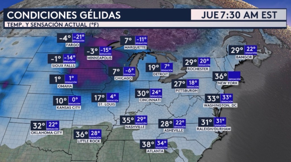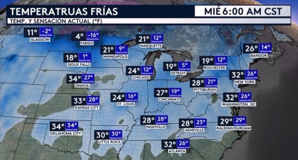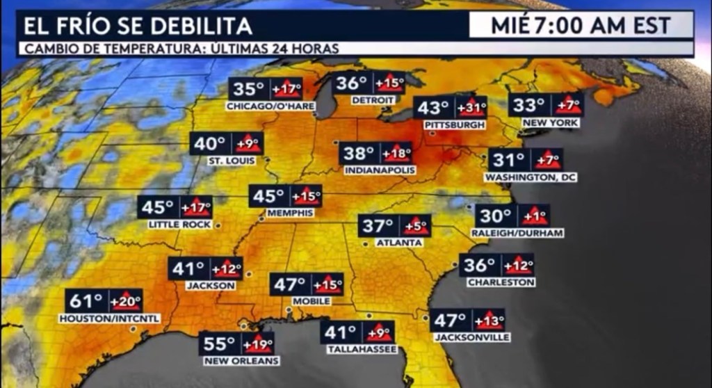 •El frío se ha debilitado a través de la mitad este del país, ya que las temperaturas a esta hora de la mañana son más cálidas de lo que vimos hace 24 horas, ¡de hasta 30°F en algunos lugares! Jacksonville y New Orleans que ayer estaban en el punto de congelación por la mañana ahora están en el rango de los 40°F y 50°F, respectivamente.