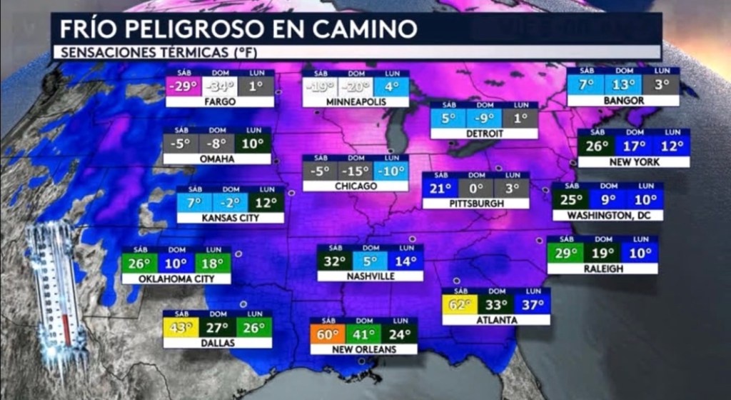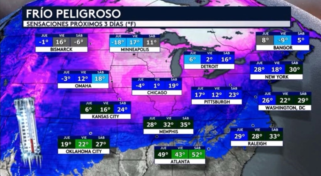 •Tendremos una montaña rusa de temperatura en el Medio Oeste y en la región que precisamente habíamos visto esa cobertura de nieve en nuestro bucle de satélite visible de ayer. Las máximas estarán ascendiendo para todas las ciudades mostradas incluyendo Chicago entre hoy y mañana jueves debido a un flujo cálido y húmedo del sur que se estará estableciendo por delante de un sistema frontal que se acercará del oeste. Un frente frío pasajero después causará a que las temperaturas vuelvan a bajar para el viernes. ¡Este descenso en temperaturas será tan drástico como sea posible con algunos lugares como Chicago, Detroit, Columbus, Louisville, Marquette y St. Louis experimentando una máxima que será de 20 a 30°F más fría del jueves al viernes!