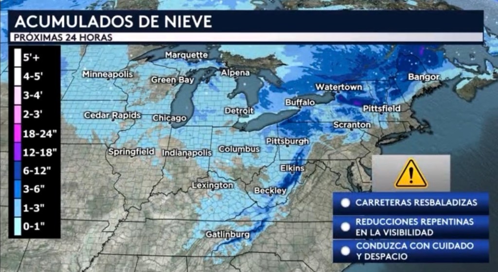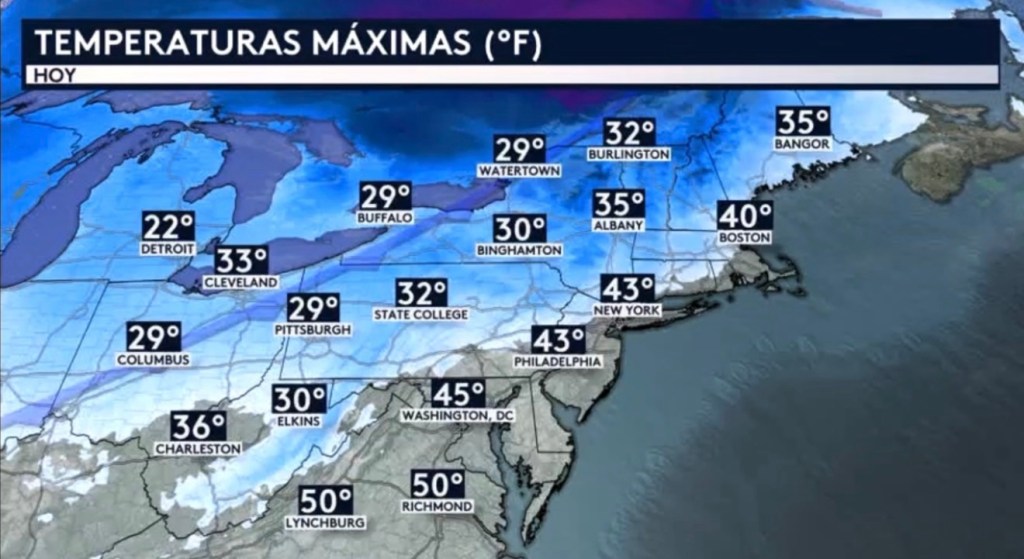 •Si miramos al pronóstico de esta Navidad, que ahora está a solo 8 días de distancia, coincidirá más o menos con la climatología donde las elevaciones altas del oeste tendrán una Navidad blanca, es decir al menos una pulgada de nieve ya en el suelo, al igual que el nivel norte, los Grandes Lagos y Nueva Inglaterra. ¡Una región que no fue mencionado en el mapa de la climatología que sí pudiera tener una Navidad blanca este año es el corredor de la interestatal 95 en el noreste! Parece como que un sistema estará trayendo nieve acumulable a lugares como la ciudad de Nueva York y Boston en tiempo para la Navidad, pero esto todavía está sujeto a cambios.