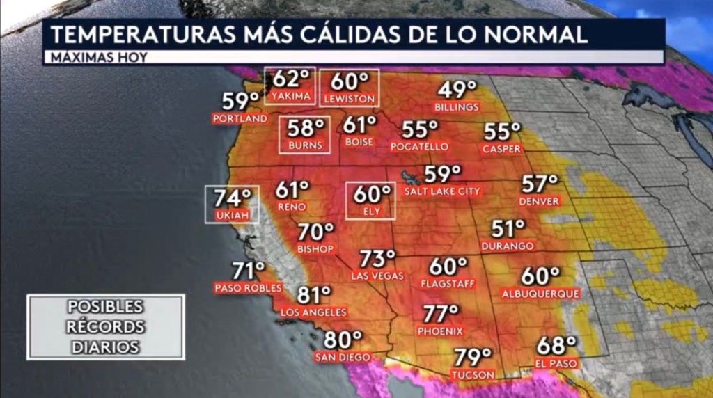 •No solo en el noreste, sino también a través del oeste y las Gran Planicies estaremos observando un calor fuera de temporada durante los próximos días donde varias ciudades estarán coqueando con récords diarios de temperatura máxima cada día entre hoy y al menos el sábado. Los posibles récords de hoy y mañana se encontrarán a través del oeste intermontañoso, la Gran Cuenca y el Desierto Suroeste. A partir del viernes y sábado, este calor se irá desplazando cada vez más al este, llegando hacia la proximidad de las Rocosas y las Gran Planicies, permitiendo a que ciudades como Dallas, Texas vean un posible récord de temperatura máxima el sábado.
