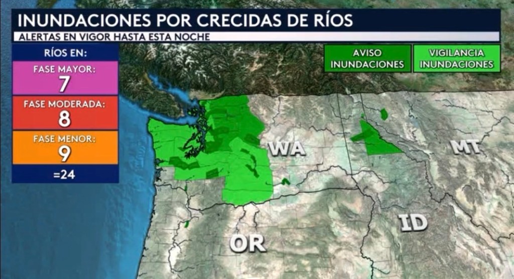 Con respecto a las precipitaciones, hay avisos por tormenta invernal para el oeste de Wyoming incluyendo los Tetons y Yellowstone y el norte de las Rocosas en Montana incluyendo el Parque Nacional Glacier debido a las fuertes nevadas que se esperan. En el Pacífico Noroeste y para ciudades como Seattle y Portland sigue en vigor una vigilancia por inundaciones hasta el sábado por la mañana debido a que 6 a 10 pulgadas adicionales de lluvia serán posibles en puntos aislados a través del terreno montañoso de los Cascades de Washington y Oregón hasta entonces.
