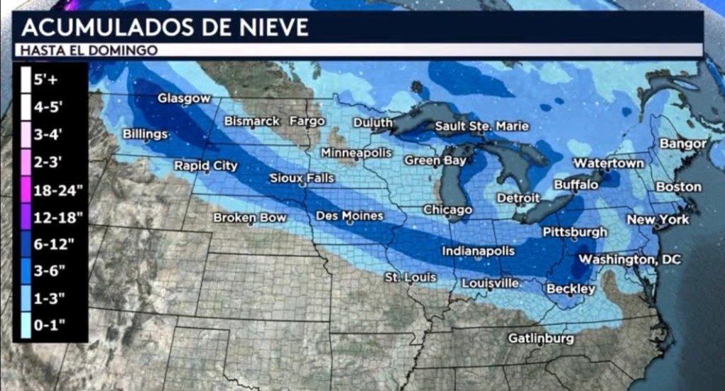 •¡Vemos un impresionante bucle de satélite visible de ayer del Medio Oeste donde podemos ver la nieve que se ha acumulado en la superficie! No confunden las nubes con la nieve, ya que las nubes se están moviendo y la nieve no. El 28.4 % del Medio Oeste actualmente está cubierto de nieve mientras que la máxima profundidad de esta nieve es de 13.9 pulgadas. Esto es una prueba de la gran cantidad de nieve que hemos recibido en lo que va de temporada, ¡ya que el promedio para la fecha es de solo 7 décimas de pulgada!