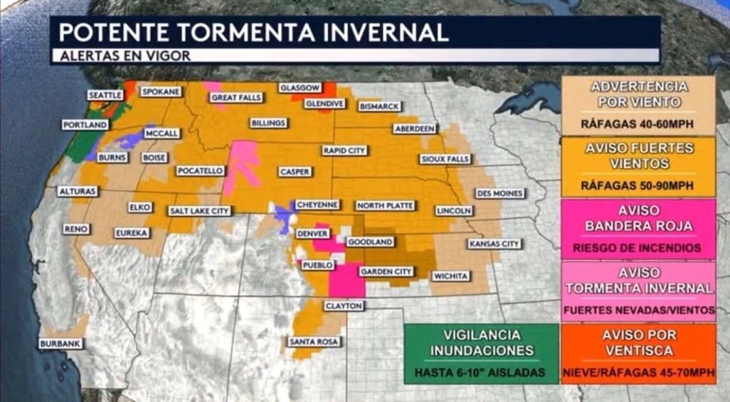 Esos fuertes vientos, en combinación con la nieve que estará cayendo, pudieran producir condiciones de ventisca en las Altas Planicies del noroeste de Montana al igual que en los Cascades y Parque Nacional Olímpica de Washington. También tenemos avisos por bandera roja en vigor para el este de Colorado debido a que estos fuertes vientos y bajos niveles de humedad estarán provocando un riesgo elevado de incendios.