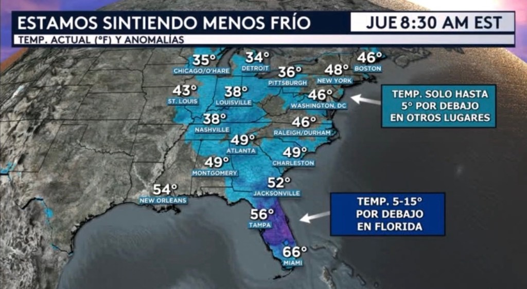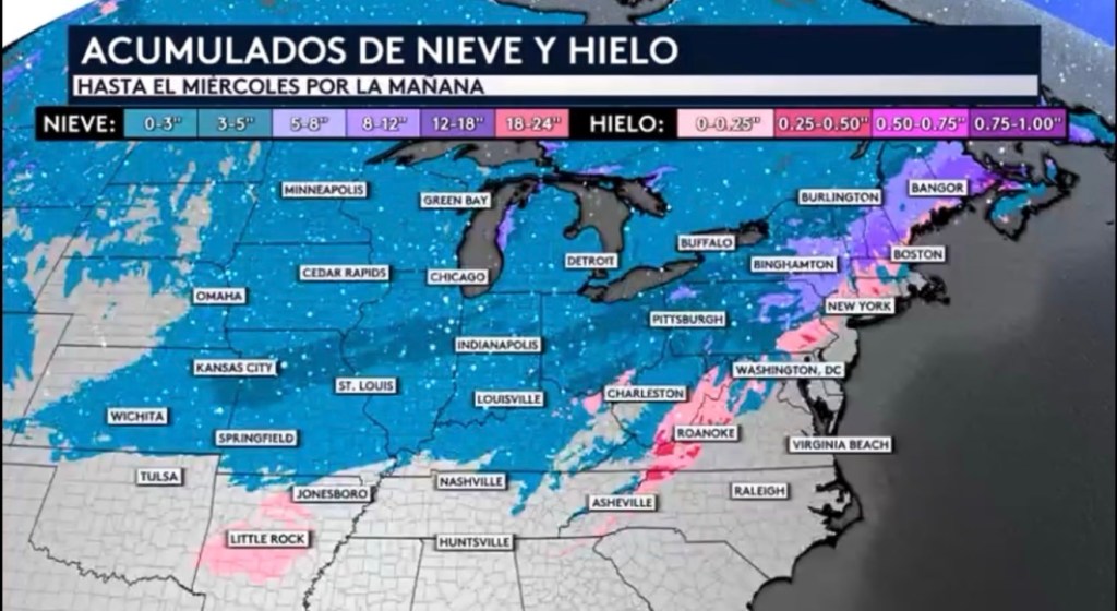Con respecto al noreste, los modelos han sido bien consistentes en mostrando las nevadas más fuertes quedándose al interior del corredor de la interestatal 95 y lugares como Washington DC, Philadelphia y la ciudad de Nueva York. La única excepción será Boston, donde sí estamos pronosticando una ligera acumulación de nieve. Las demás ciudades antes mencionadas deben estar recibiendo lluvia y no nieve. Más al interior del Atlántico Medio y Nueva Inglaterra es donde tendremos la mayor acumulación de nieve, ya que nuestro modelo de pronóstico nos muestra que pudiéramos ver en algunos lugares hasta un pie de nieve acumulable que incluye áreas de elevación más alta como las Montañas Poconos, Cat Skills, Berkshires, Verdes y Blancas.