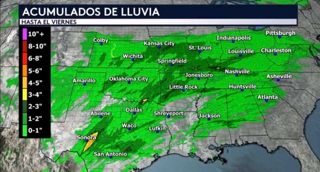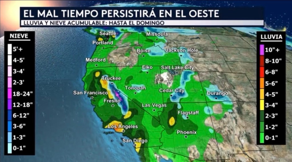 •Lugares en el Medio Oeste como Chicago no estarán recibiendo tanta nieve como la que recibieron con la tormenta invernal de este fin de semana pasado, solo hasta 3 pulgadas. Mas al sur hacia el Valle Inferior de Missouri, el Valle Medio de Mississippi y el Medio Oeste Inferior tendremos una franja de acumulados ligeramente más altos de entre 3 a 5 pulgadas.