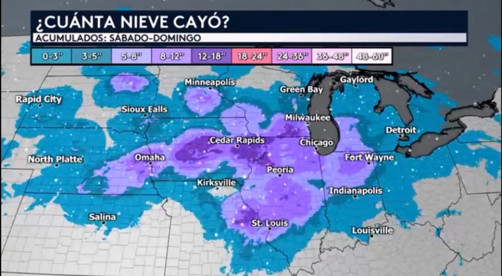 •Se registraron fuertes nevadas este fin de semana festivo pasado no solo en Chicago sino también a través de otras partes del Medio Oeste. Nuestros estimados de radar del sábado hasta el domingo nos muestra que tuvimos totales de nevadas muy dispersos de más de 5 pulgadas en el color morado que incluye ciudades como Chicago, St. Louis, Milwaukee, Omaha, Cedar Rapids y Fort Wayne. ¡Tuvimos lugares aislados en Iowa e Illinois que recibieron entre 18 a 24 pulgadas de nieve!
