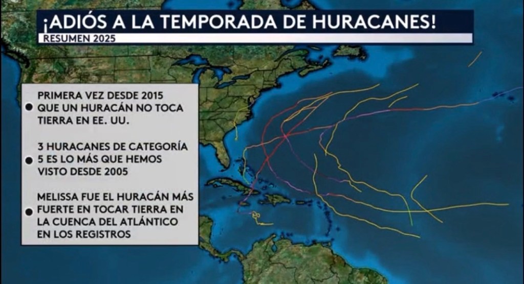 •Con hoy siendo el primer día de diciembre, ¡les decimos oficialmente adiós a la temporada de huracanes del Atlántico 2025! Esta temporada fue por debajo del promedio con respecto a la cantidad de tormentas tropicales y huracanes que se generaron en comparación con el promedio climatológico de 30 años. La temporada de 2025 produjo 13 tormentas con nombre (cuando lo normal es 14), 5 huracanes (cuando lo normal es 7), y 4 huracanes mayores de categoría 3 o mayor (cuando lo normal es 3).