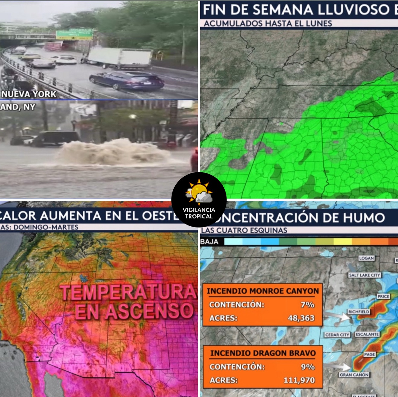 •No solo en el Medio Oeste y los Grandes Lagos sino también a través de la región de las Cuatro Esquinas (los estados de Utah, Colorado, Arizona y Nuevo México) estaremos vigilando a los cielos por la bruma. Dos gran incendios: uno al norte de Arizona en el Gran Cañón conocido como el Incendio Dragon Bravo y otro al sur-centro de Utah conocido como el Incendio Monroe Canyon estarán provocando mala calidad de aire para lugares a barlovento de los vientos soplando del suroeste. Uno de los estados que serán más afectados es Colorado, donde ciudades como Denver y Fort Collins estarán bajo una alerta por mala calidad de aire para esta jornada del viernes.