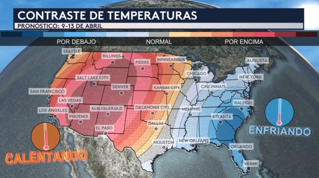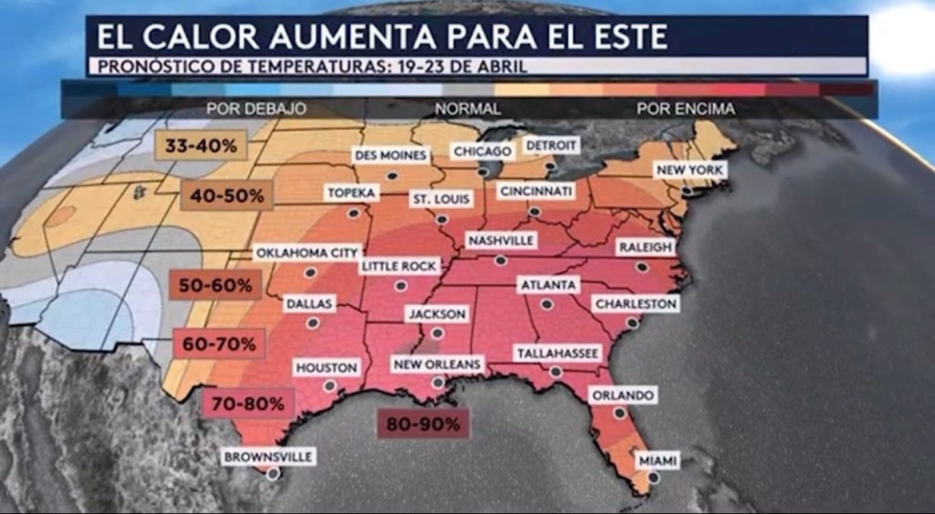 •El pronóstico de temperaturas para el fin de semana de pascua y la semana entrante, entre el 19-23 de abril precisamente, muestra una calentamiento para el este del país. Hay probabilidades de hasta un 80 a 90 % de que el sureste y ciudades como Houston, New Orleans, Nashville, Atlanta y Raleigh experimenten temperaturas por encima del promedio.