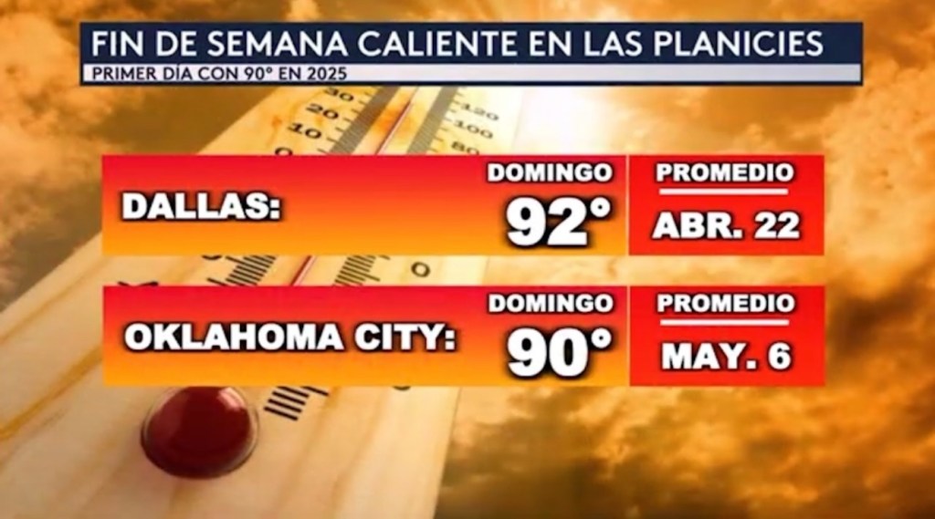 •Fue un fin de semana caliente para el centro y sur de las planicies y para ciudades como Dallas en Texas y Oklahoma City en Oklahoma que registraron su primer día del año con una temperatura máxima de 90°. Dallas el domingo tuvo una máxima de 92° y Oklahoma City se 90°. La fecha promedio del primer día con una temperatura de 90° en Dallas es el 22 de abril y el 6 de mayo en Oklahoma City. Es decir, las dos ciudades están a unos 8 y 22 días, respectivamente, adelantadas.