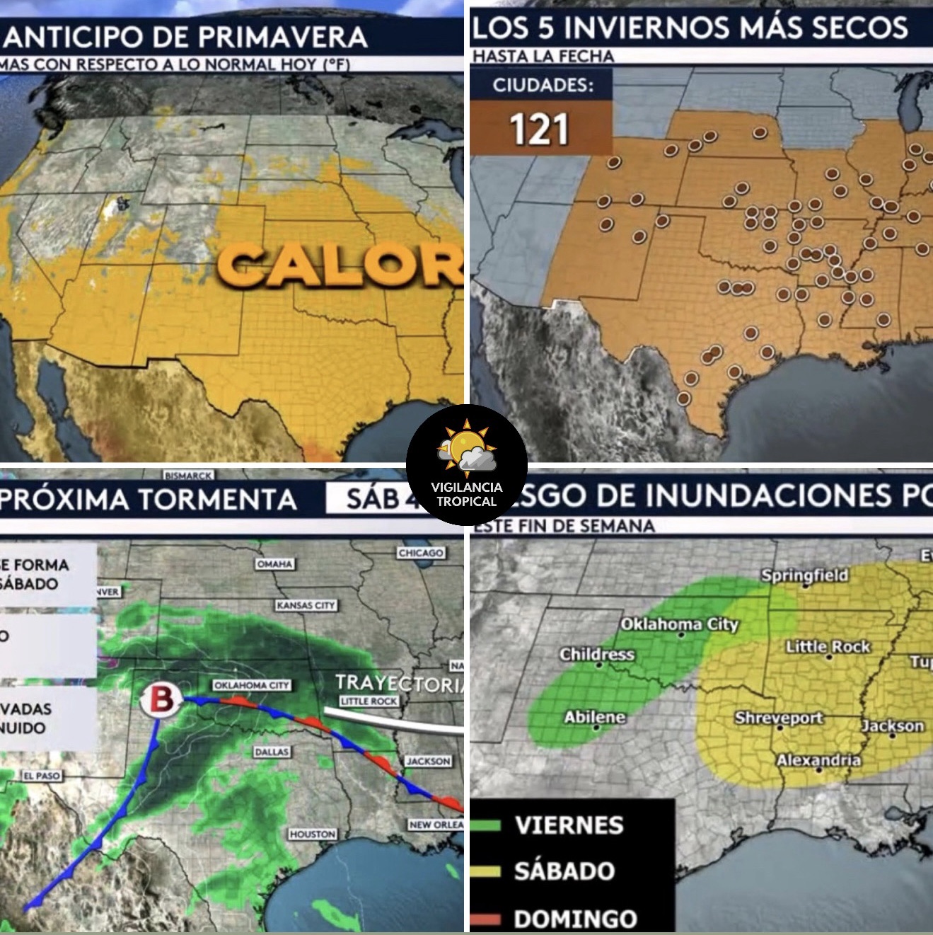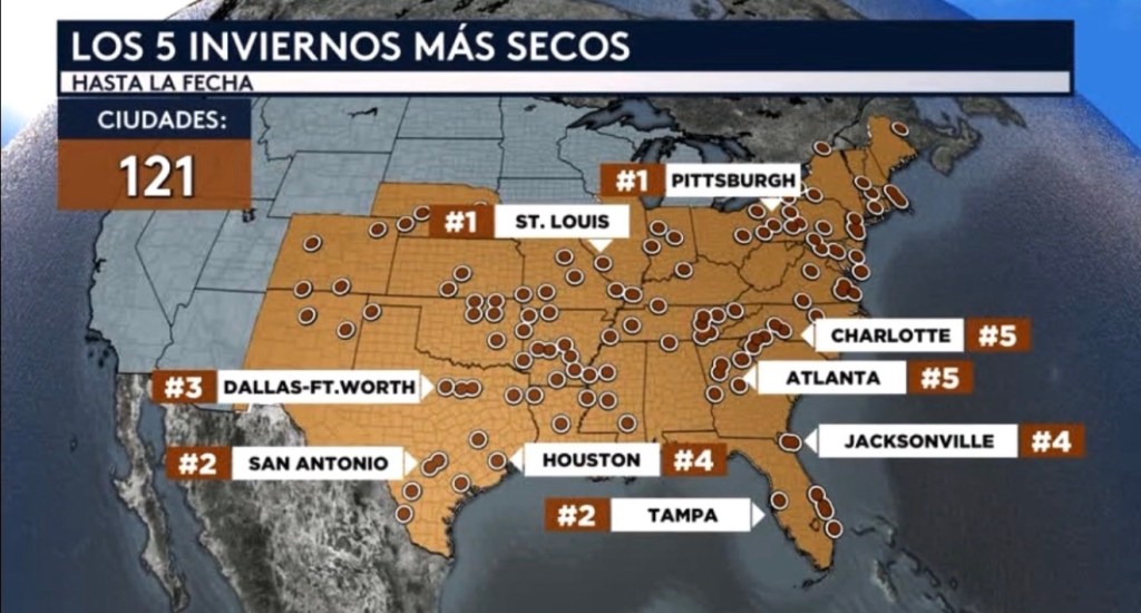 •Este invierno ha sido uno de los más secos en los registros no solo para algunas ciudades, ¡sino para 121 de ellas! Todos los puntos marrones que ven en el mapa desde Nuevo México hasta Maine representan ciudades que han experimentado sus cinco inviernos más secos en los registros hasta la fecha, incluyendo a Dallas, San Antonio, Houston, Tampa, Jacksonville, Atlanta, Charlotte, St. Louis y Pittsburgh.