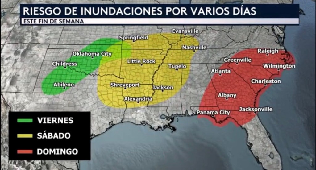 •Pasamos a nuestro próximo riesgo lo que son las fuertes lluvias. Habrá un riesgo de inundaciones repentinas el viernes para el sur de las Gran Planicies incluyendo el Valle del Río Rojo, el sábado para la región Ark-La-Tx y el Valle del Río Mississippi, y el domingo para el sureste desde el norte de Florida hasta las Carolinas. Toda esta lluvia será de gran beneficio para los estados en su camino debido a la sequía que estamos experimentando, pero como siempre sabemos, mucha de esta lluvia en muy poco tiempo especialmente sobre suelos secos puede resultar en inundaciones.