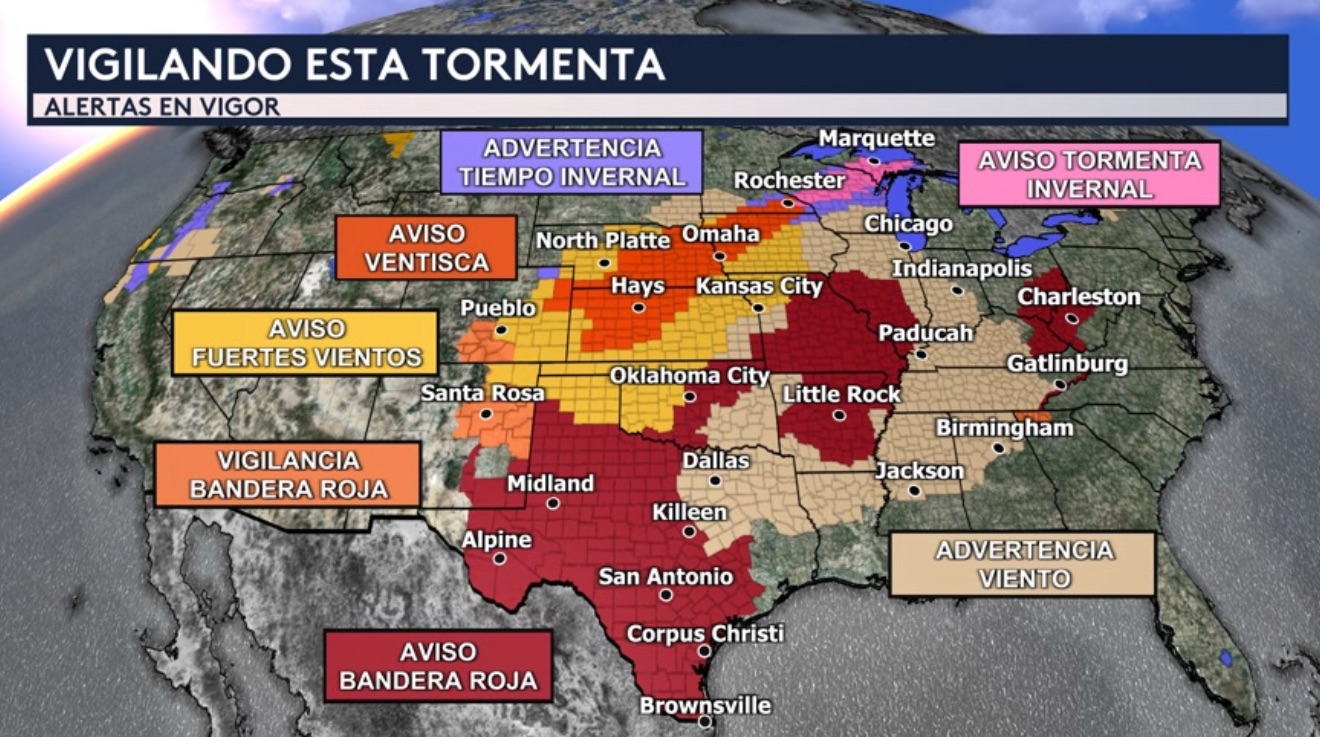 El sistema se desplazará hacia las planicies centrales del país el martes por la noche y miércoles por la madrugada, trayendo un zona estrecha de lluvias y tormentas desde el Medio Oeste hasta el sur de las planicies y fuertes nevadas para el norte de las planicies y el Medio Oeste superior.