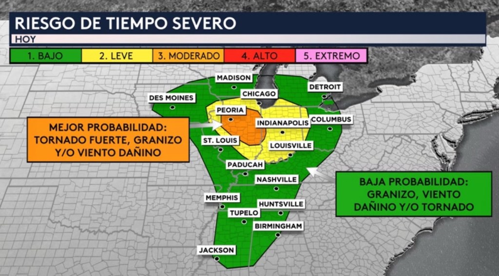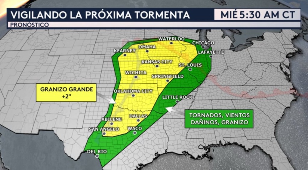 Por delante de ese frente frío en la zona cálida del sistema desde el Medio Oeste hasta el sur de las planicies se espera la posibilidad de tormentas severas nocturnas. Habrá un riesgo mínimo en el color verde para ciudades como Chicago en Illinois, St. Louis en Missouri, Little Rock en Arkansas y Waco y Del Rio en Texas. Aquí se esperan tornados, vientos dañinos y/o granizo.