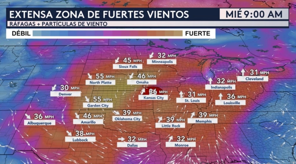 •Estaremos vigilando el desarrollo de otro sistema de baja presión sobre las Montañas Rocosas. Para el martes, se espera que este sistema traiga una antenas zona de fuertes ráfagas de viento que superarán las 30 mph en los colores rosados. Estos vientos provocarán tanto un riesgo crítico de incendios para Nuevo México, Colorado, Texas, Oklahoma, Arizona y Kansas como tormentas de polvo.
