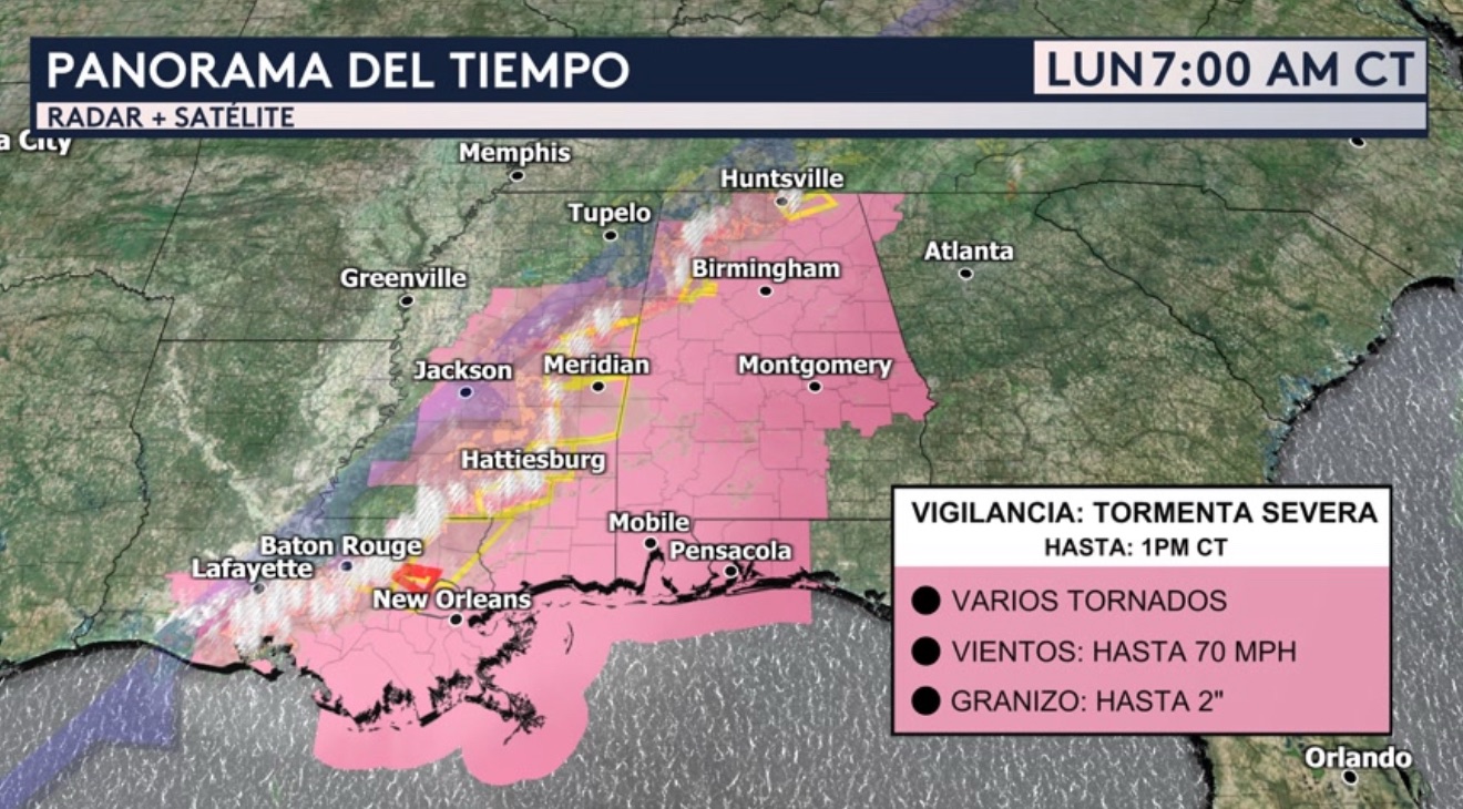 De hecho, tenemos a varias vigilancias por tormenta severa en vigor para los estados de Louisiana, Mississippi, Alabama, Georgia y el norte de Florida mientras que una fuerte línea de tormentas cruza la región a esta hora de la mañana. Estas vigilancias están en vigor hasta las 1:00PM hora central y incluyen ciudades como New Orleans en Louisiana; Mobile, Montgomery, Birmingham y Huntsville en Alabama; y Pensacola en Florida. Las amenazas con esta línea de tormentas serán varios tornados, vientos dañinos de hasta 70 mph y granizo de hasta 2 pulgadas en diámetro (el tamaño de un limón).