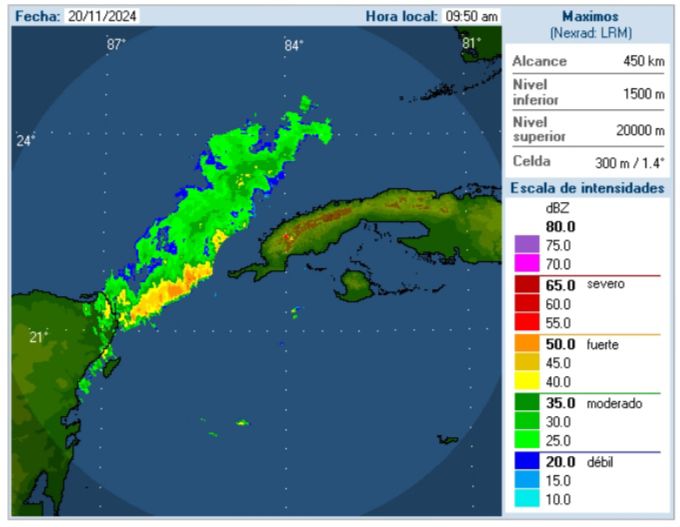 •Las imágenes de los radares meteorológicos de Casa Blanca, La Habana y La Bajada en Pinar del Rio, detectan fuertes áreas de tormentas a lo largo de unos 500 kilómetros desde el norte de la Península de Yucatán hasta Cayo Hueso, estas áreas de tormentas avanzan al sudeste y estarán llegando al occidente de Cuba en horas de la tarde y la noche deteriorando las condiciones del tiempo.