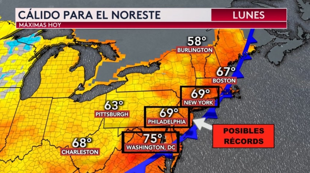 •Habrá calor para el noreste hoy, en donde ciudades como Nueva York, Filadelfia y Washington DC pudieran batir récords de temperatura máxima. Pero viene un alivio mañana detrás del mismo frente frío que trajo lluvia para esta zona con temperaturas máximas bajando a los 40 y 50°.