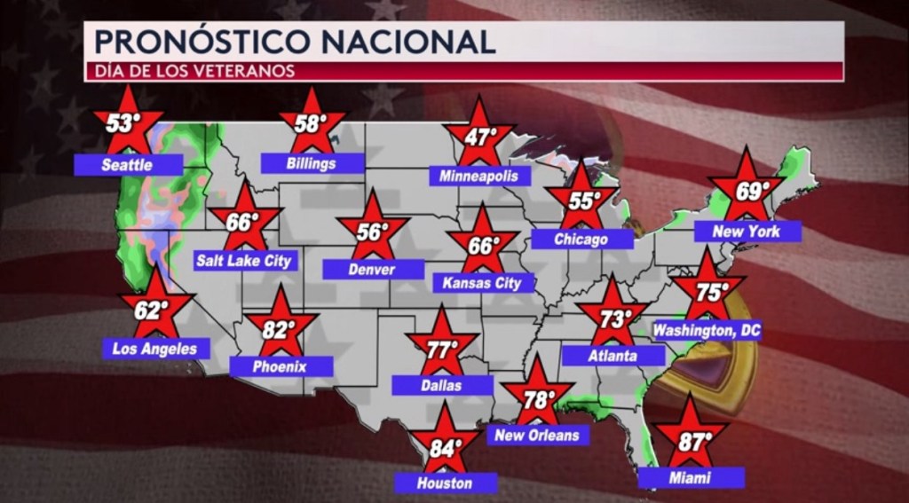•Vemos el pronóstico nacional para este día de los veteranos. Se espera lluvia para ciudades al oeste, como antes mencionado, como Seattle y San Francisco. Un día placentero hacia el resto del país con lluvia muy aislada para el interior de Nueva Inglaterra y el sureste.