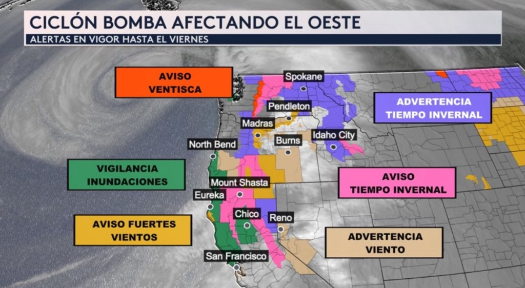 •Hay varias alertas en vigor para los estados de Montana, Idaho, Washington, Oregon, Nevada y California que incluyen de ventisca, fuertes vientos, condiciones invernales (fuertes nevadas) e inundaciones. La mayoría de estas alertas estarán en vigor hasta luego en el día hoy mientras que las vigilancias por inundaciones se mantendrán hasta el viernes por la noche.