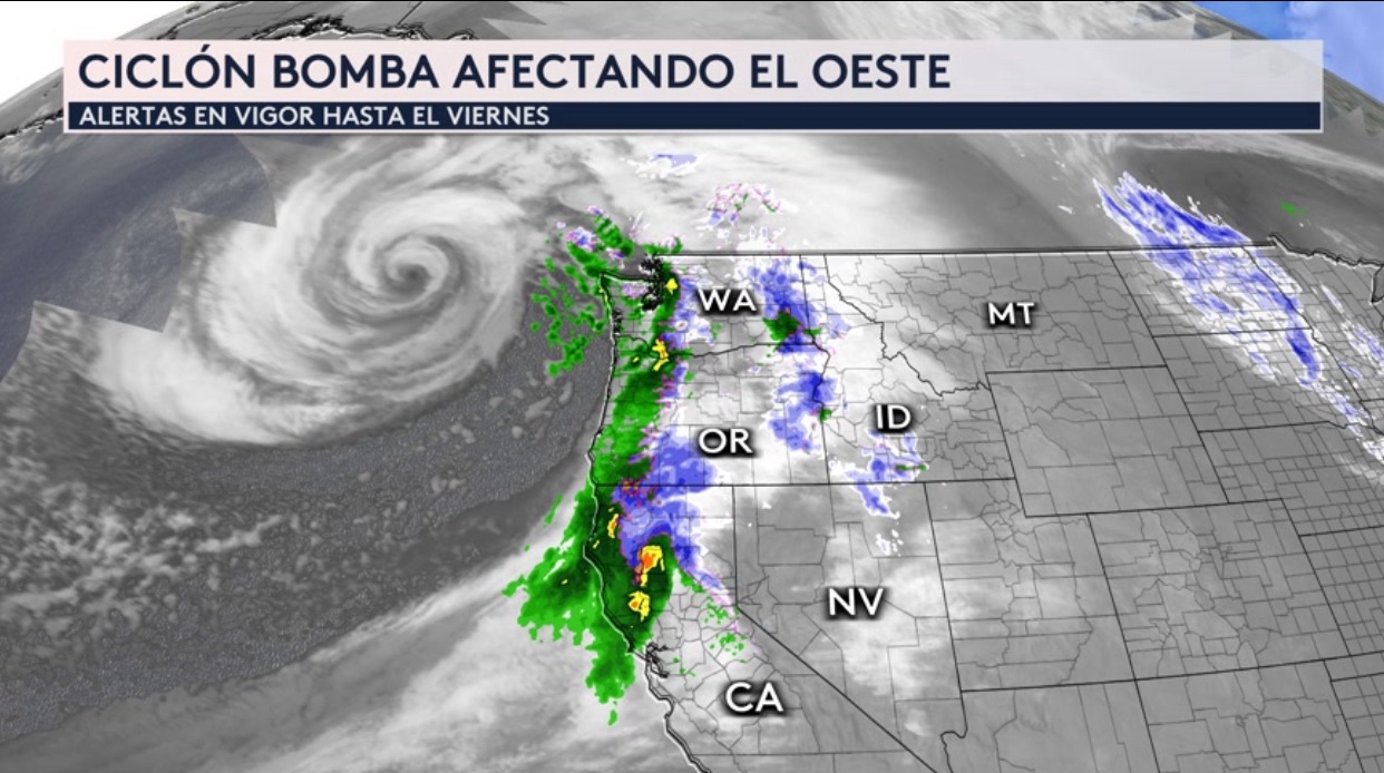 •Se mantendrá activo en el oeste del país esta semana ya que un sistema de baja presión que se intensificará rápidamente fuera de la costa traerá un abundante humedad tropical en la forma de un río atmosférico. Los riesgos serán fuertes lluvias y nevadas, vientos intensos hacia las costas de Washington, Oregon y California, apagones, árboles caídos y oleaje dañino de más de 20 pies en altura.