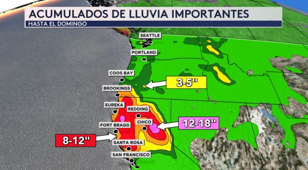 Este evento de río atmosférico producirá lluvias intensas, especialmente al norte del estado de California y al sur del estado de Oregon. Los acumulados pudieran llegar a las 18 pulgaradas al norte de California desde hoy hasta el domingo por la mañana. Ciudades que pudieran ser afectadas son Redding, Chico, Eureka, Crescent City, Ukiah y Fort Bragg. Para el sur de Oregon, son posibles hasta 12 pulgadas de lluvia para ciudades como Brookings.