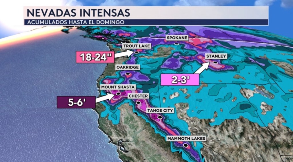 Hasta el domingo, se pronostica hasta 4 pies de nieve para las Montañas de Cascades en los estados de Washington y Oregon. Al norte de California, son posibles más de 5 pies de nieve alrededor de la zona de Mount Shasta.