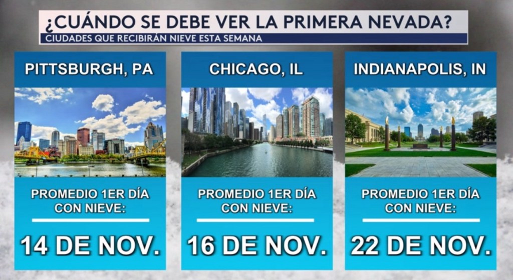 •¡Las ciudades de Pittsburgh, Chicago y Indianápolis estarán recibiendo sus primeras nevadas de la temporada esta semana! Están más o menos a tiempo con respecto al promedio de cuando deben recibir la primera nevada. El promedio para la primera nevada en Pittsburgh es el 14 de noviembre, 16 de noviembre en Chicago y 22 de noviembre para Indianápolis.