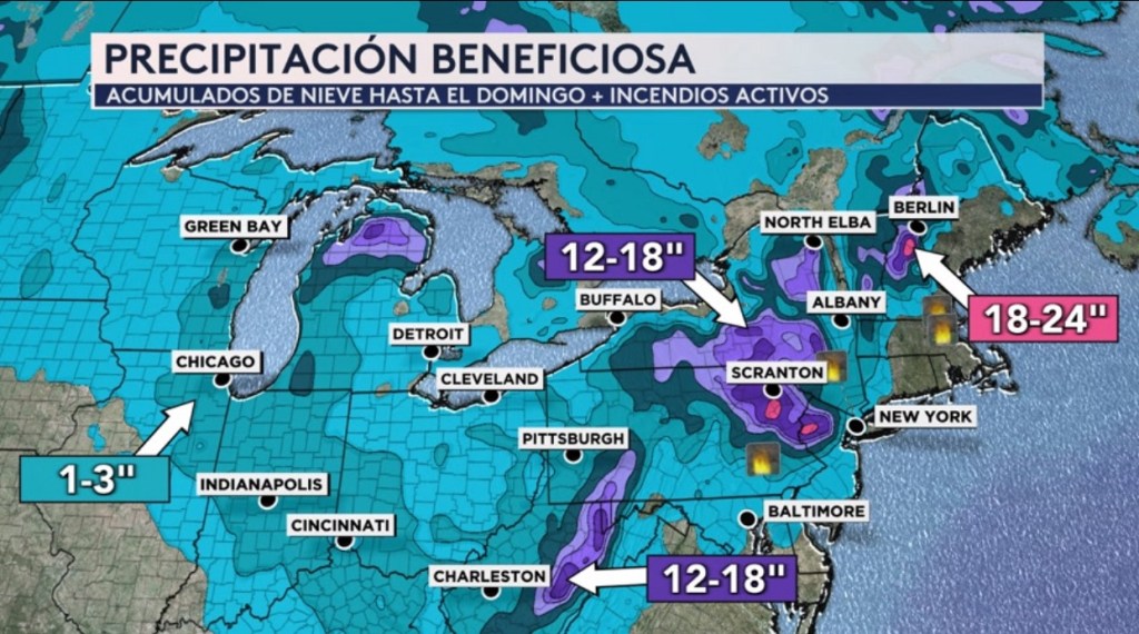 •También se pronostican hasta 2 pies de acumulados de nieve para las Montañas del estado de Nuevo Hampshire y en las elevaciones montañosos del interior de Nueva Jersey y Pennsylvania. Hasta 18 pulgadas son posibles para el interior del estado de Nueva York, para los Apalaches y el norte de Michigan.